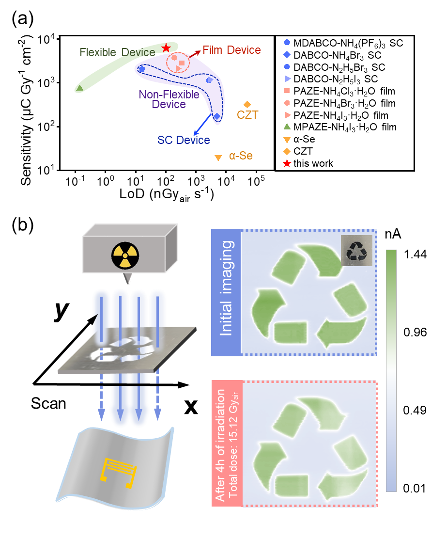 近日,我院赵奎教授团队提出了一种针对报废钙钛矿X射线探测器的“一键重启”环保回收的新型策略,该工艺简单且环保,无需进一步的化学处理、提纯和额外的添加剂/催化剂以及复杂的设备。利用水对老化的无金属钙钛矿单晶器件进行一键回收和再利用,实现了可持续的材料—器件循环。利用回收材料制备出环保可穿戴的大面积柔性薄膜探测器,实现了超高的平均灵敏度(6204 ± 268 μC Gyair–1 cm–2)和较低的检测限(102.3 nGyair s–1),是可穿戴X射线探测器的最高性能之一,该器件进一步实现了清晰的X射线成像。