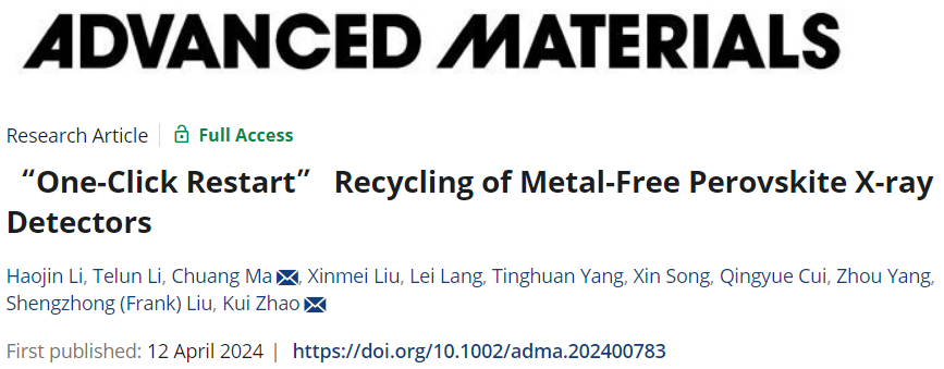 总之,“一键重启”的方法为以后处理报废器件提供了一种经济有效且可持续发展的回收工艺。这种工艺绿色环保、能完全回收利用所有材料并能实现媲美新鲜单晶器件性能的可穿戴柔性器件。这些优势大大增强了此类新型探测器的商业化潜力。相关研究工作以 “One-Click Restart” Recycling of Metal-Free Perovskite X-ray Detectors为题,发表在国际顶级期刊《Advanced Materials》上。