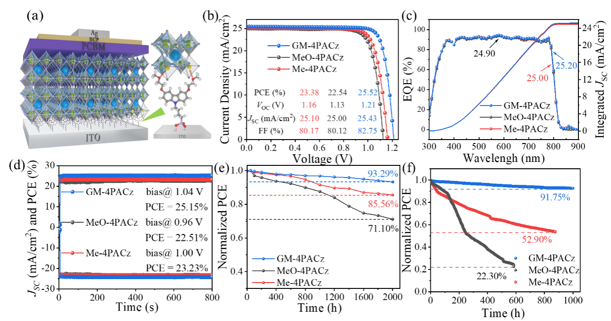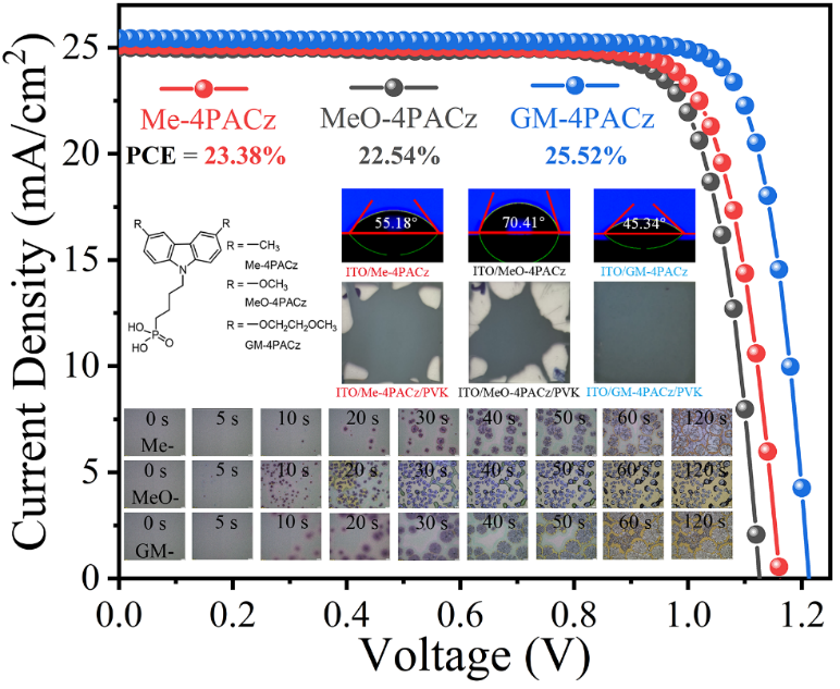 鉴于以上问题,我院刘治科教授团队开发合成了一种新型OSAM,在咔唑基单元引入乙二醇单甲醚(GM)侧链,将合成所得的4-(3,6-乙二醇单甲醚-9H-咔唑-9-基)丁基]膦酸(GM-4PACz)作为空穴传输层。GM基团的引入增强了氧化铟锡(ITO)/SAM衬底的表面能,以促进钙钛矿薄膜的成核和生长,抑制阳离子缺陷,释放SAM/钙钛矿界面处的残余应力,并优化能级排列。最终,基于GM-4PACz的IPSC实现了25.52%的光电转换效率,1.21 V的高开路电压(VOC)和优异的稳定性,器件在空气中老化2000小时后保持初始效率的93.29%,在最大功率点跟踪1000小时后保持初始效率的91.75%。