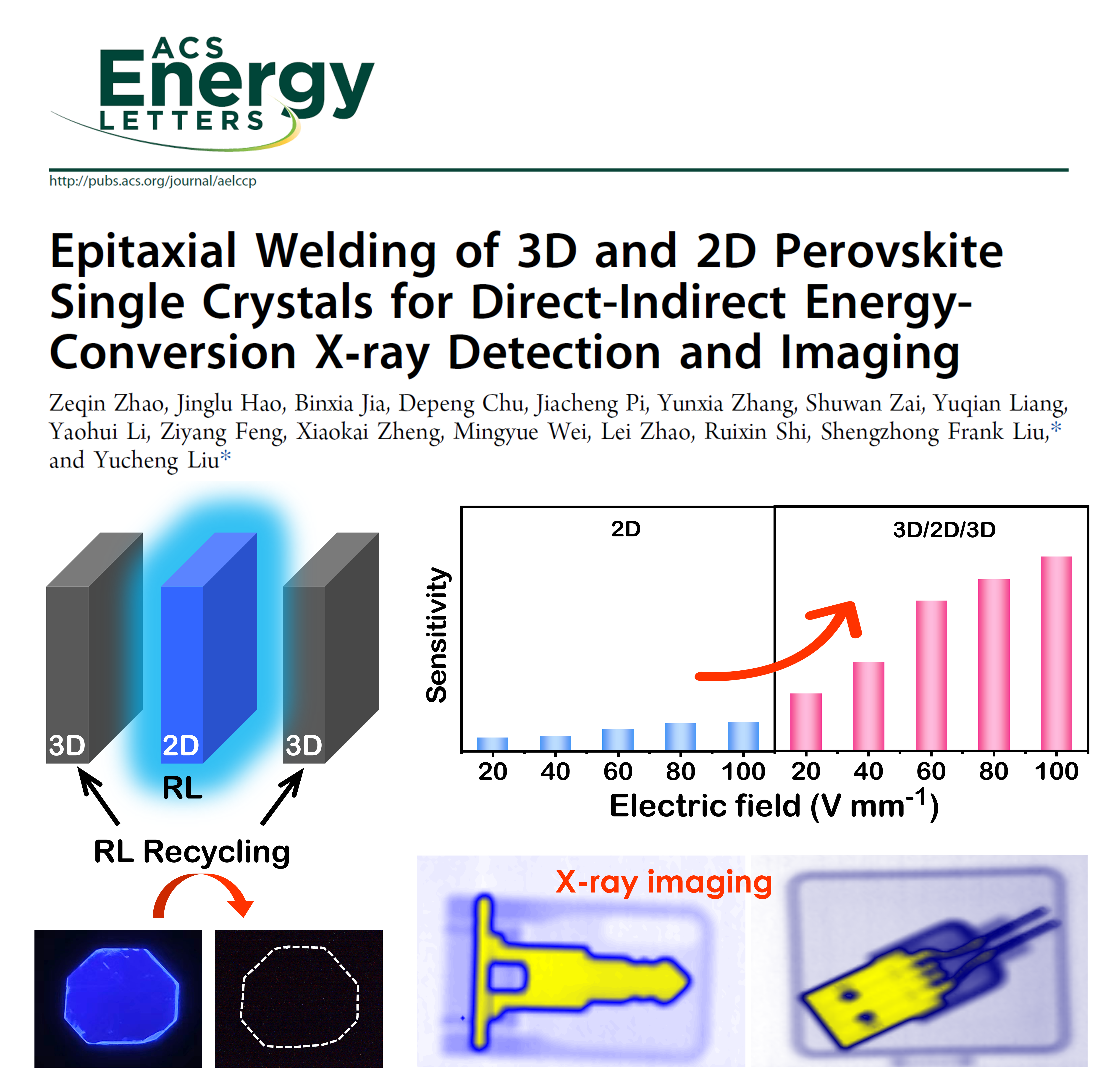 基于此,我院钙钛矿材料与器件团队成功地将具有高载流子迁移率的3D钙钛矿单晶与具有高电阻率和低离子迁移的二维钙钛矿单晶通过原位外延焊接,得到了3D/2D/3D 钙钛矿单晶。在该单晶中,2D钙钛矿的RL可以完全被3D钙钛矿回收利用,从而增强了X射线检测过程中的能量转换效率。因此,3D/2D/3D 单晶X射线探测器的灵敏度提升了实现了566%,以及具备14.2 nGy s−1的超低检测限。优异的稳定性和高的探测灵敏度使得3D/2D/3D 单晶X射线探测器实现了分辨率为13.8 lp mm−1的X射线成像。该研究为设计稳定、灵敏的X射线探测器提供了一种新的策略。该工作近日发表于国际知名期刊《ACS Energy Letters》上。