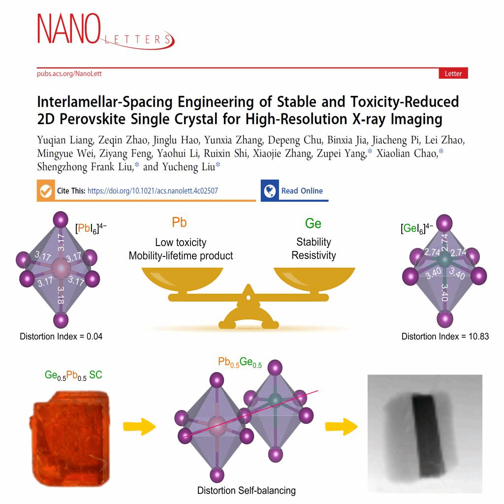 基于此,我院钙钛矿材料与器件团队结合第一性原理计算和晶体结构设计,并基于晶格畸变自平衡的层间距调控策略获得了高稳定且毒性降低的2D钙钛矿单晶。由于该单晶具有高的稳定性、大的载流子迁移率-寿命积,因此使用该单晶制备的探测器实现了高的X射线探测性能,包括高达13488 μC Gy-1 cm-2的探测灵敏度、低至8.23 nGy s-1的检测限以及8.56 lp mm–1的X射线成像空间分辨率,以上性能参数均远优于高毒性的2D结构Pb基钙钛矿探测器。该工作为低成本开发低毒、高性能的X射线探测器提供了新的技术方案。该工作近日发表于国际著名期刊《Nano Letters》上。