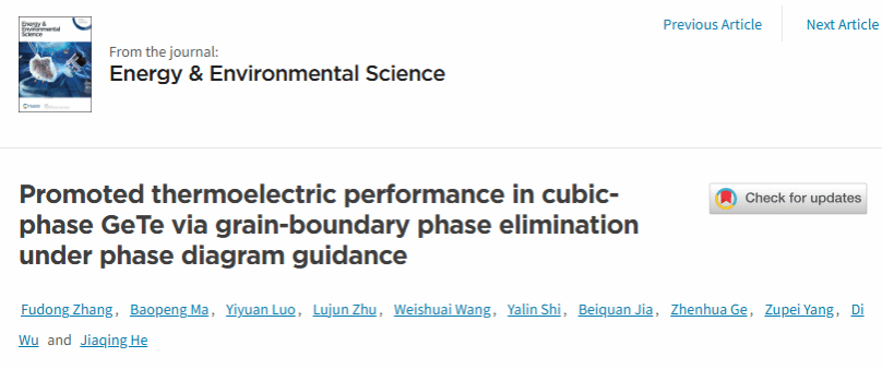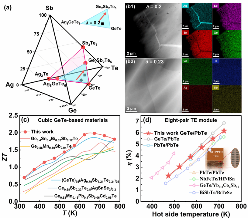 近日,我院铁电功能材料与器件创新团队杨祖培教授、吴笛教授基于相图预测,通过在(GeTe)x(Ag1-δSb1+δTe2+δ)100-x体系中精细调控合金比x和Ag/Sb比值δ, 在保持其立方相结构的同时成功地消除了Ag8GeTe6晶界相,实现了热电性能的显著提升。最终在673 K时获得了~2.0的热电优值,以及~1.5的平均热电优值(323-773 K)。制备的热电器件在480 K温差下实现了6.3%的发电效率和1.32 W的输出功率,属于该体系领先水平。相关研究工作以Promoted thermoelectric performance in cubic-phase GeTe via grain-boundary phase elimination under phase diagram guidance为题,发表在国际材料顶级期刊《Energy & Environmental Science》上,该研究工作为立方相GeTe基热电器件在中温热电发电机中的实际应用提供了强大的推动力。