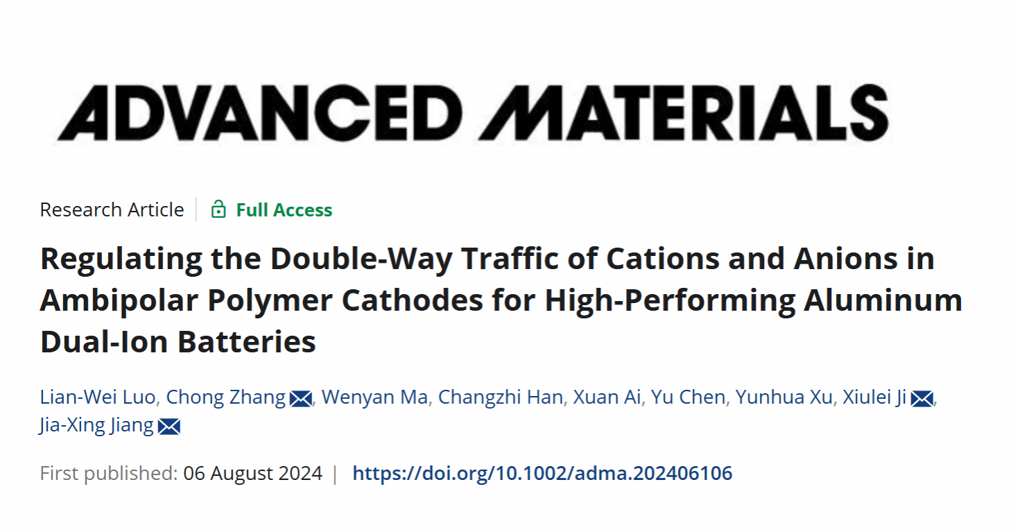 该研究工作为开发具有高电子和离子传输性能的有机正极材料提供了有效的设计思路。相关成果以"Regulating the Double-Way Traffic of Cations and Anions in Ambipolar Polymer Cathodes for High-Performing Aluminum Dual-Ion Batteries"为题发表在国际期刊《Advanced Materials》上。