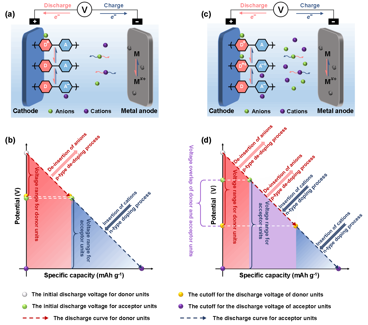近日,我院铁电功能材料与器件创新团队张崇副研究员联合江汉大学蒋加兴教授以及俄勒冈州立大学纪秀磊教授在有机-铝双离子电池领域取得重要研究进展。团队通过利用电解液诱导的电子给体与受体之间的电化学电势区间重合,实现了给-受体型聚合物电化学反应过程中的原位掺杂,有效促进了其n/p-型掺杂反应中的离子和电子传输。制备的双极性给-受体型共轭聚合物作为铝双离子电池的正极材料能够实现205 mAh g−1的比容量,即使在15 A g−l下仍具有160 mAh g-1的比容量,循环6万次后的容量保持率为78.4%。该聚合物正极材料在100 mg cm−2的活性物质负载量下能够实现17 mAh cm−2的面积容量。