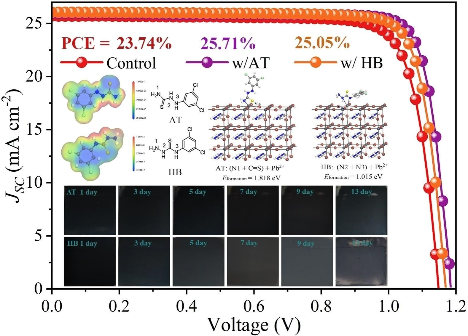 近日,我院刘治科教授团队设计并合成了两种硫脲衍生物异构体[(3,5-二氯苯基)氨基硫脲](AT)和N-(3,5-二氯苯基)肼基羧硫酰胺(HB)。通过对不同分子结构进行深入研究后发现,分子间基团相互作用对于改善钙钛矿缺陷具有重要意义。特别是,在所研究的两种异构体中,AT表现出更强的协同缺陷钝化能力。具体来说,AT能够通过N1和C=S基团与Pb2+缺陷发生有效配位作用,形成高达1.818 eV的缺陷形成能,从而促进了高质量薄膜的形成,包括高结晶度、大晶粒尺寸及低缺陷密度等特点。相比之下,HB由于受到较大空间位阻的影响,在与钙钛矿相互作用时效果较弱。基于上述理论指导,研究人员采用AT处理FACsPbI3基PSCs器件,并将其与对照组及使用HB处理过的器件进行了对比。结果显示,经过AT处理后的器件不仅实现了高达25.71%的光电转换效率(经认证为24.66%),而且展现出优异的稳定性:即使在空气中放置长达2000小时或在最大功率点连续运行1000小时后,仍能保持初始效率的91.0%和95.2%。这些数据充分证明了AT作为一种新型钝化剂的巨大优势。