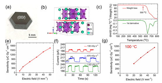 X射线探测器广泛应用于医学诊断、环境监测,工业无损检测、安全检查等领域。现用于X射线探测的材料普遍存在制备温度高,工艺复杂,成本高等特点。近几年,低成本、制备工艺简单的有机无机杂化铅卤钙钛矿在直接X射线探测方面已展现出优异的性质,如高的X射线吸收系数,低的X射线检测限以及高的灵敏度等。但是,要实现应用还存在以下几个问题:(1)含有大量的高毒性铅会限制其广泛应用;(2)含有有机组分,其热稳定性较差;(3)高的离子迁移率,使得制备的器件工作稳定性差。尤其是需要在高电场下工作的X射线探测器,离子迁移导致非常明显的响应不稳定性。(4)低的体电阻率,使得器件产生较高的暗电流。上述问题极大地限制了有机无机杂化钙钛矿材料在X射线探测方面的应用。