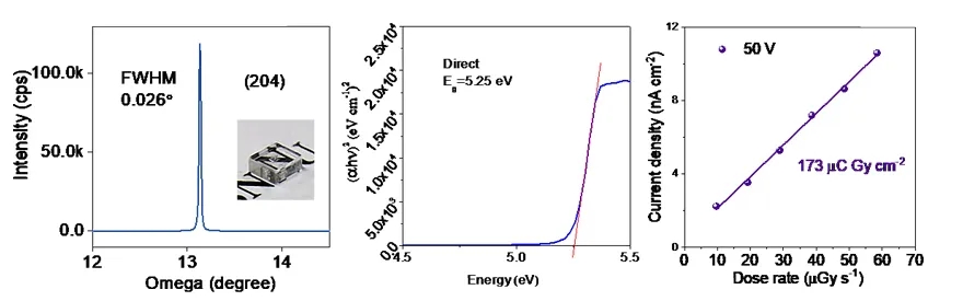 金属基钙钛矿半导体材料在X射线探测方面展示了巨大的前景。但是由于金属具有较大的密度从而有较大的质量,在一些需要便携或者轻质量探测器的场合并不适用,例如X射线防护服上携带的检测装置,智能标签探测装置等。由于有机材料密度与人体当量接近更符合人体特征,且重量很轻,所以用于上述X射线检测是比较合适的。因此,我院和西北工业大学、以色列魏茨曼科学研究院的合作团队制备了一种不含金属的有机钙钛矿作为新型半导体材料并探究其基本光电性质,以适用于X射线探测。突破了以往有机单晶生长困难的问题,生长出了5×5×2 mm3的DABCO-NH4Br3钙钛矿结构的大尺寸单晶,单晶结晶质量较好,具有很低的缺陷态密度(8.1×1010 cm-3)和很小的半高峰宽。这种材料在可见光区没有任何吸收,最大程度的减少了探测过程中可见光对器件的影响;大的电阻导致了器件具有较大的暗电流从而降低了器件的噪声增加了灵敏度,从而得到了清晰的成像结果。作者对这种无金属钙钛矿材料的电荷传输特性进行了探究,想了解是什么导致了价带导带的传输。通过密度泛函理论计算发现导带主要是由有机大分子贡献,价带主要是由卤素贡献。电学测试还展现了长的电荷传输寿命。与传统有机材料相比具有较大的载流子扩散长度(28-55 μm)和迁移率(2 cm2·V-1·s-1),在探测性质上比传统有机材料有更高的灵敏度、更低的启动电压和低的检出限。
