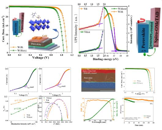 近日,我院刘生忠教授团队利用1,3-二甲基-3-咪唑六氟磷酸盐 (DMIMPF6)离子液体对钙钛矿吸收层表面缺陷进行“钝化”,理论计算和实验结果表明,[DMIM]+与钙钛矿表面的Pb2+结合,可以有效钝化Pb-I反位点缺陷,从而显著抑制非辐射复合,也使电池效率从21.09%提高到23.25%,DMIMPF6离子液体天然疏水,能够阻挡水分子对钙钛矿吸收层的侵蚀,进而有效提高钙钛矿太阳电池器件的环境稳定性。