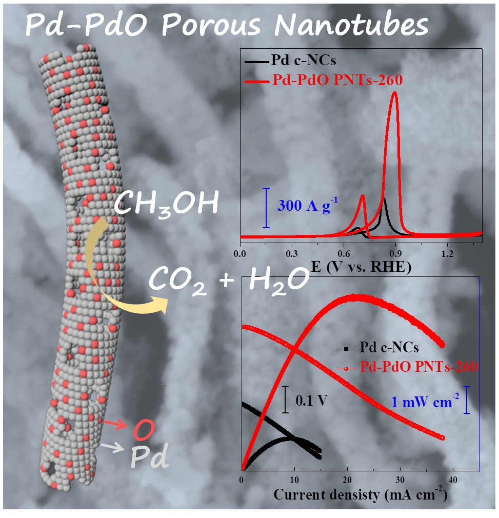我院陈煜教授团队使用一种简便的自模板法,以Pd(II)-DMG配合物纳米棒为前驱体,合成了异质结构的高质量Pd-PdO PNTs。在合成过程中,Pd(II)-DMG配合物纳米棒的煅烧温度决定了产物的组成。Pd-PdO PNTs具有独特的一维多孔中空结构,具有ECSA大、传质快、自身结构稳定性好等优点,使其在碱性介质中具有较高的电催化活性和稳定性。此外,与Pd PNTs相比,Pd-PdO PNTs表现出更强的MOR活性,表明Pd/PdO界面的存在提高了Pd纳米晶的MOR活性。电化学测试和理论计算结果表明,PdO与Pd的协同作用加速了COads的氧化,从而提高了Pd-PdO PNTs的MOR活性和稳定性。在ADMFCs性能测试中,Pd-PdO PNTs作为阳极电催化剂时功率密度是商业化Pd纳米晶的4.6倍且具有更大的开路电压,这样的结果说明Pd-PdO PNTs在ADMFCs器件中的性能优于商业化Pd纳米晶。