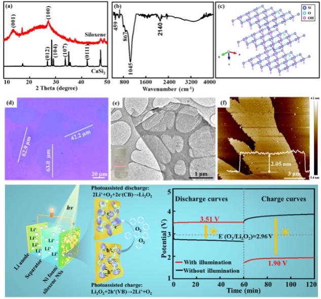 近日,我院刘宗怀教授和李琪副教授课题组,采用拓扑化学剥离法成功制备了超大尺寸少层硅氧烯纳米片,并将其应用于光辅助Li-O2电池的光电极。剥离所得硅氧烯纳米片横向尺寸可达63 mm,厚度约为~2.05 nm,具有Kautsky型晶体结构。根据半导体特性测试和电极电势能级分布,硅氧烯纳米片的导带和价带能级电势有利于促进Li2O2的形成/分解,可吸收可见光作为Li-O2电池双功能光催化剂。将所制备的硅氧烯纳米片作为光电极,金属锂作为负极,组装光辅助Li-O2电池。该电池呈现出高的放电电压(3.51 V)和超低充电电位(1.90 V),首次电能转换效率高达185%。同时,该光辅助电池还具有优异的倍率性能(1 mA / cm2、能量效率仍可达129%)、超长的循环寿命(100次循环放/充电后效率保持率为92%)和高的可逆比容量(0.75 mA/cm2、1170 mAh/g)。该研究工作丰富了Li-O2电池光催化剂体系,为实现太阳能与电能的高性能转换和存储提供了巨大机遇。