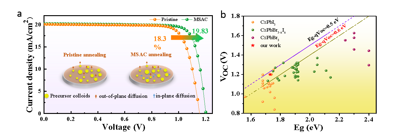 今年伊始,我校刘生忠教授课题组等人利用熔盐辅助结晶(MSAC)策略来改善全无机钙钛矿薄膜的晶粒生长。与传统的溶剂退火相比,MSAC通过对流和扩散的方式实现了更快的传质,这有利于前驱体胶体之间的相互作用;另外,熔融盐的引入改变了中间相,降低了钙钛矿晶体的形成能垒,减少了钙钛矿薄膜形成的能量和时间成本。此外,熔盐辅助结晶有助于诱导钙钛矿晶粒的面内生长,抑制孔洞和裂缝的形成,从而形成高质量的钙钛矿薄膜。MSAC制备的器件从18.3%提升到19.83%,其提升主要源于VOC和FF的提高。处理后器件VOC和FF的增强表明钙钛矿薄膜晶体质量的显著提高,且MSAC制备的器件具有更好的稳定性,所得器件VOC赤字低至0.53 eV,在该体系中获得了较低的开压损失。该策略提供了一种新颖的薄膜生长设计,可以有效地制备高质量薄膜以实现高的光电转换效率。