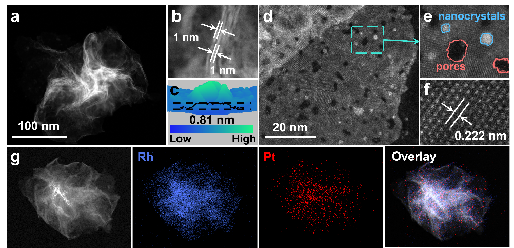 能源是国民经济和社会发展的重要物质基础和内在动力,开发基于可持续清洁能源的高效电化学能源转换技术是能源领域研究热点。直接乙醇燃料电池由于其原料乙醇具有无毒、来源广泛、易于储存、能量密度高等优点,正受到越来越多的关注。然而,阳极乙醇氧化动力学缓慢、氧化过程不完全、催化剂易毒化等因素制约了直接乙醇燃料电池的发展和应用。因此,开发具有高抗毒化能力和强C-C键裂解能力的电催化剂至关重要。陈煜教授课题组在铑基电催化剂(Adv. Energy Mater. 2022, 12, 2103916; Appl. Catal. B- Environ. 2023, 337, 12296; Adv. Energy Mater. 2024, 2400112)和原子厚度二维纳米材料(Adv. Funct. Mater. 2024, 34, 2310288; Adv. Funct. Mater. 2024, 34, 2310730; Adv. Funct. Mater. 2024, 2315949)合成的前期研究基础上,通过简单的蚀刻-置换策略成功制备出二维多孔铑铂双金属烯。因其具有高原子利用率、丰富的低配位原子以及铑-铂双原子协同效应,铑铂双金属烯表现出优异的电催化性能,能够有效实现乙醇完全电氧化并显示良好的抗毒化能力。该工作不仅介绍了一种构建具有高活性低配位原子纳米结构的有效策略,还揭示了具有低配位数的双金属活性位点在促进电催化过程中的基本作用。