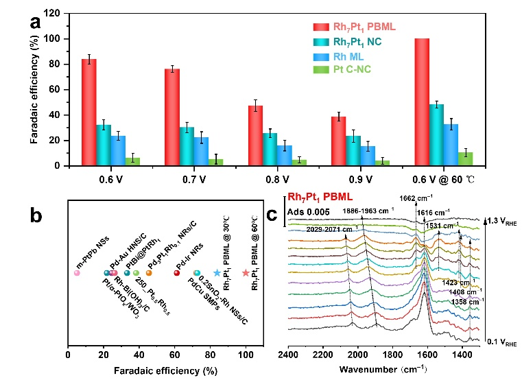 图2 (a)法拉第效率 (b)近年来报道的先进催化剂 (c)原位红外测试