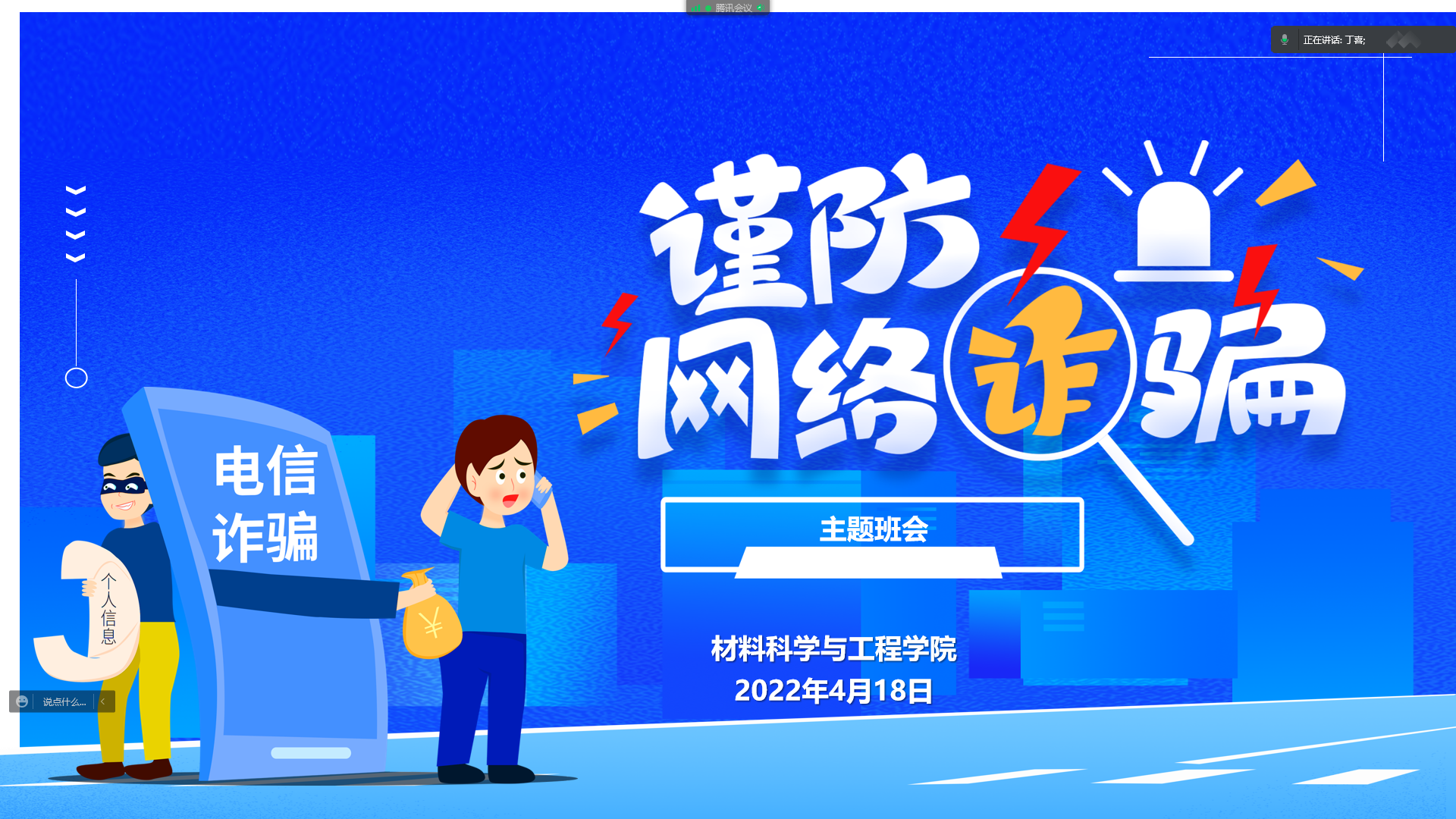 为切实增强学生的安全防范意识,提高同学们防范识别电信网络诈骗的能力,预防电信网络诈骗事件的发生,学院于4月17日晚在线上召开了“谨防网络诈骗”安全教育主题班会。会议由丁喜主持,雁塔校区全体学生参加此次班会。