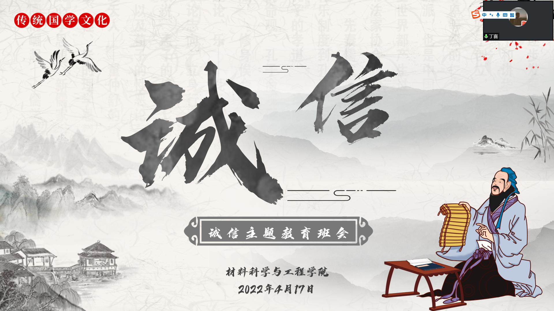 为加强同学们的诚信意识,培养“讲诚信、树诚信、践诚信”的新时代青年大学生,4月17日下午,学院在线上召开了诚信教育主题班会,雁塔校区所有学生参加了班会,班会由丁喜主持。