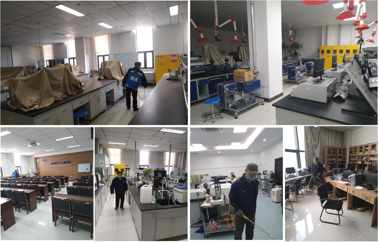 其次,4月27日-29日,学院对所有本科实验室、科研实验室、研究生交流室和会议室等场所进行全面消杀,不留死角,复学前给师生们提供一个安全的实验工作环境。同时制定了复学后消杀的详细办法和监管制度。