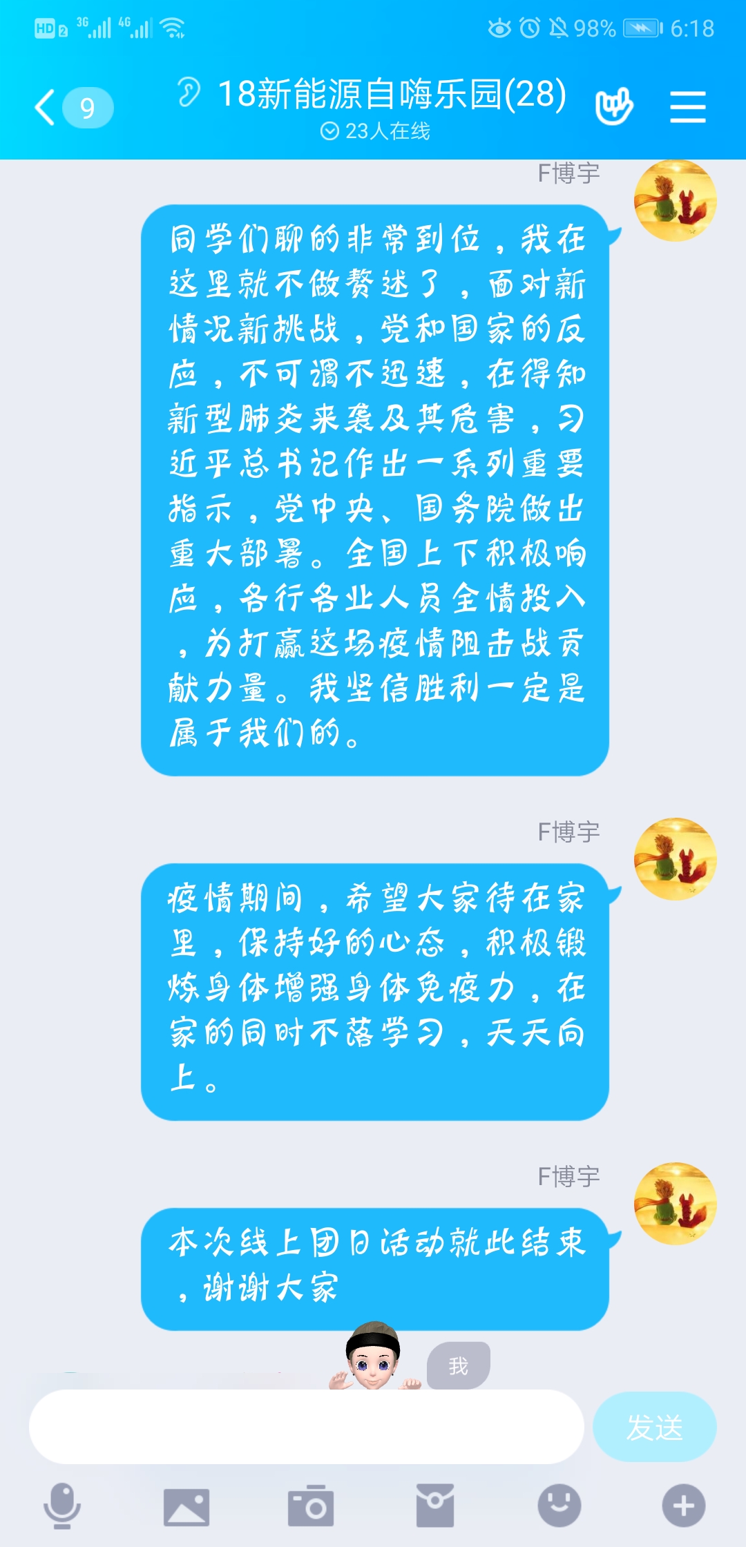 2018级1班和2班团支部的同学们在班级QQ群里谈在这次疫情中的思考和感触,同学们表示,疫情当前,每位同学都是责任人。我们应该向战“疫”先锋钟南山学习“士不可以不弘毅”的深沉担当;向战“疫”先锋李兰娟学习“绝知此事要躬行”的专注实干。作为新时代大学生我们更应该知道战线就在脚下,初心行将致远;学在当下,即刻战“疫”!