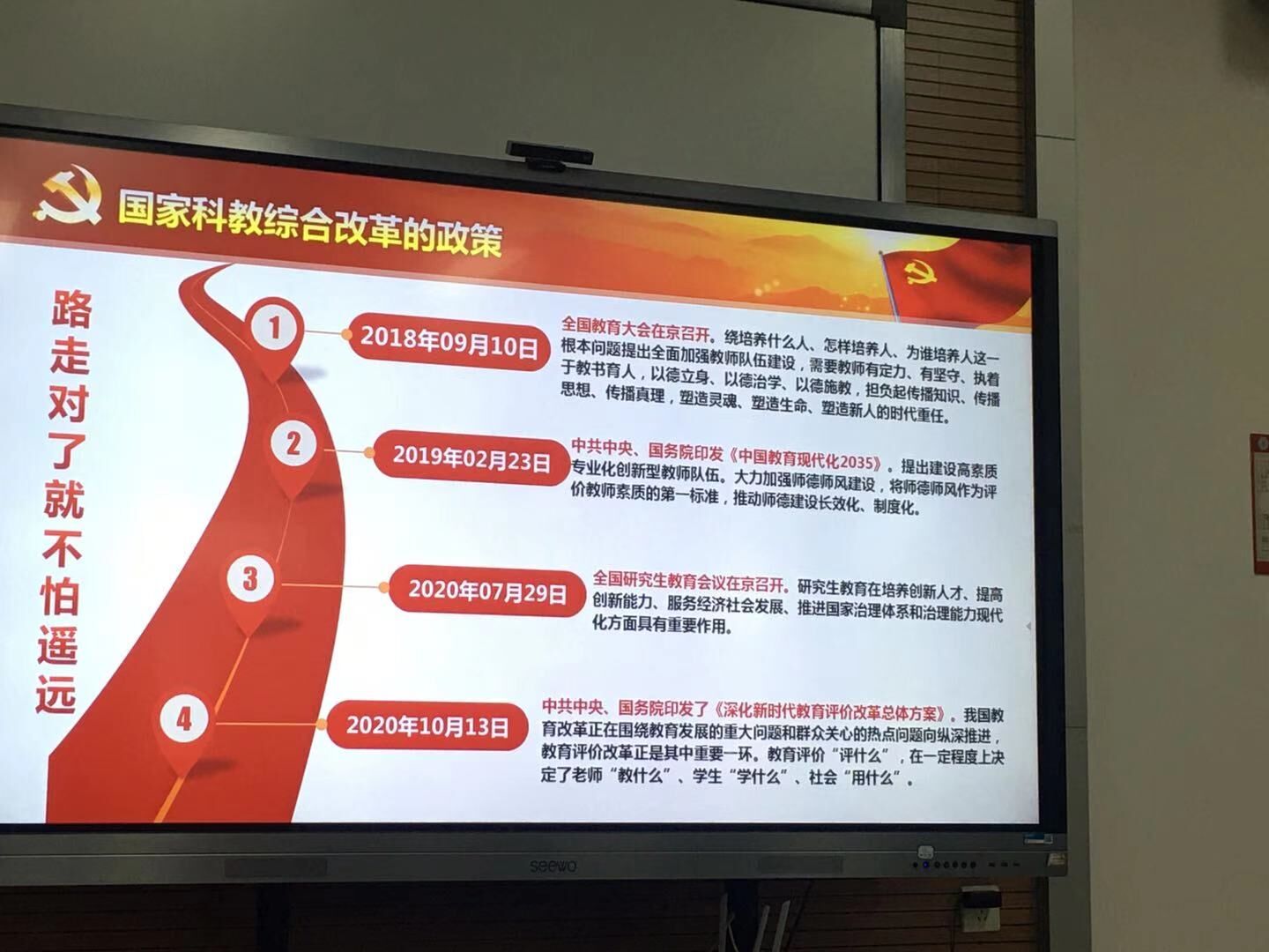 陈新兵院长首先介绍了《深化新时代教育评价评价改革总体方案》以及之前出台的一系列教育文件,系统讲解了国家科教综合改革的相关政策。指出我国教育改革正在围绕教育发展的重大问题和群众关心的热点问题纵深推进,教育评价改革正是其中重要一环,教育评价“评什么”,在一定程度上决定了教师“教什么”,学生“学什么”,社会“用什么”。