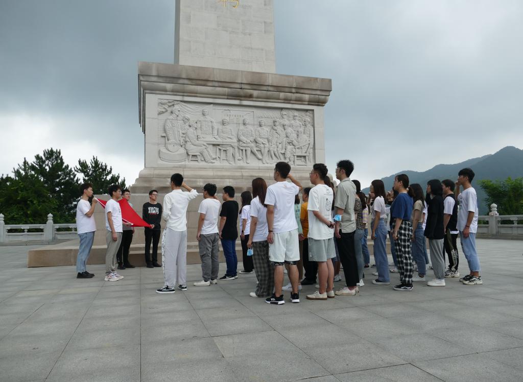 随后,我们一起前往陕甘边革命根据地纪念碑参观。纪念碑地面到碑顶的高度是33米,象征着1933年创建了陕甘边照金革命根据地。其上镌刻着的“陕甘边革命根据地的英雄们永垂不朽”十六个大字,伟大神圣。在无数革命先烈的见证下,全体党员重温入党誓词。