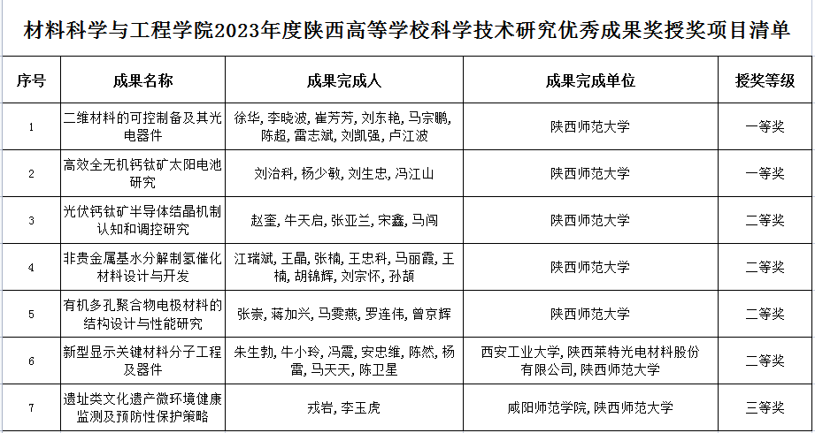 近日,2023年度陕西高等学校科学技术研究优秀成果奖表彰名单公布,我院7项成果获奖。其中,我院作为主持单位获一等奖2项,二等奖3项,较去年增长67%,获奖数量位居我校第一,占我校作为主持单位获奖比例21%。作为参与单位获二等奖1项,三等奖1项。实现在科技成果奖励的重大突破,数量和质量方面实现双飞跃。